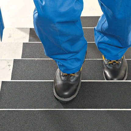 Противоскользящая универсальная лента Mehlhose GmbH цвет черный ширина 50 мм длина 18,3 м износостойкость 1 млн шагов M1SR050183 - противоскользящее покрытие с зерном из оксида алюминия, основа из ПВХ, самоклеящаяся сторона с защитной лентой для защиты клеевого слоя, акриловый клеевой слой, толщина без защитной пленки <1 мм.